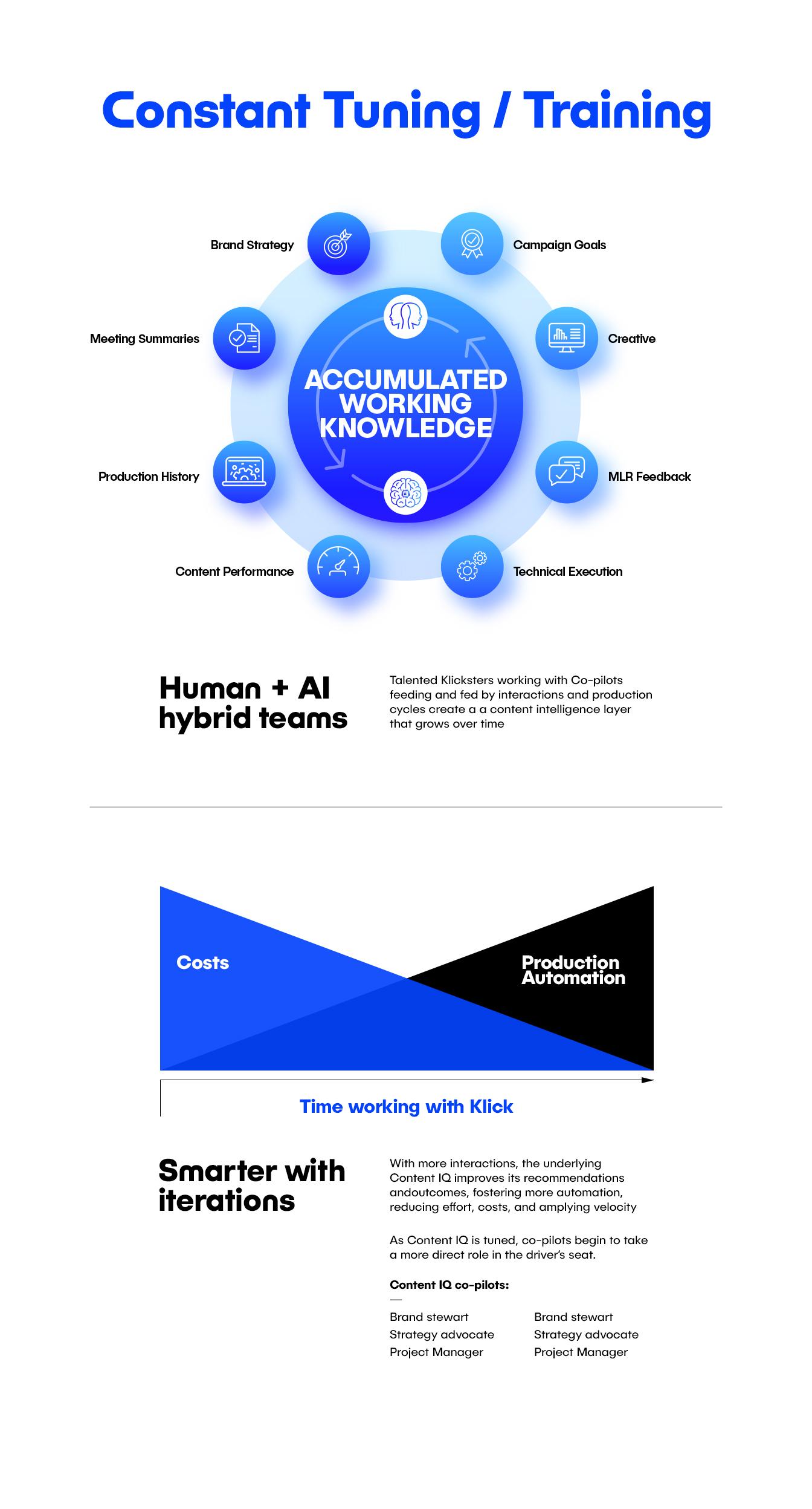 Engaging with every Klick SME team and service gives you access to some of the brightest minds in their fields and the shared knowledge of their entire team. This understanding fuels the intelligence and efforts of our people (via AI copilots) and their AI Twin. Complex tasks are delegated to the talented individuals you hire, augmented by their AI copilot and shared SME intelligence, while their AI Twin observes and learns. The AI Twin can autonomously complete low-value or low-complexity tasks, while the SME is continually informed and actively represented by their copilot.