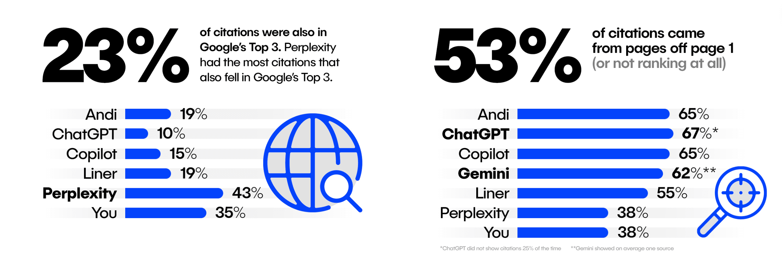 Diversity of Sources and Beyond the Top 3 Organic Results: Although all generative AI platforms pulled responses from one or more of the top three organic search results in Google, they also included a more comprehensive range of sources. Many cited content from sources beyond the first page of Google results.