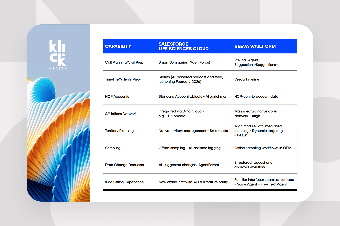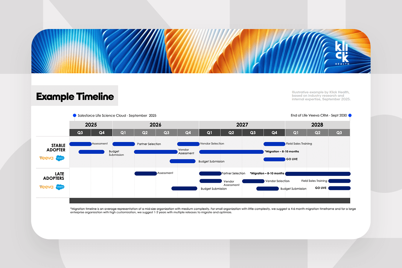 CRM migration reflects how organizations view their ability to adapt and evolve. From Klick’s perspective, Salesforce is providing a new and exciting offering but still has a lot to prove in the market, while Veeva is delivering a familiar and proven user experience with exciting enhancements. The question for leadership is not just which platform to adopt but how to intentionally use this moment to advance their commercial model.